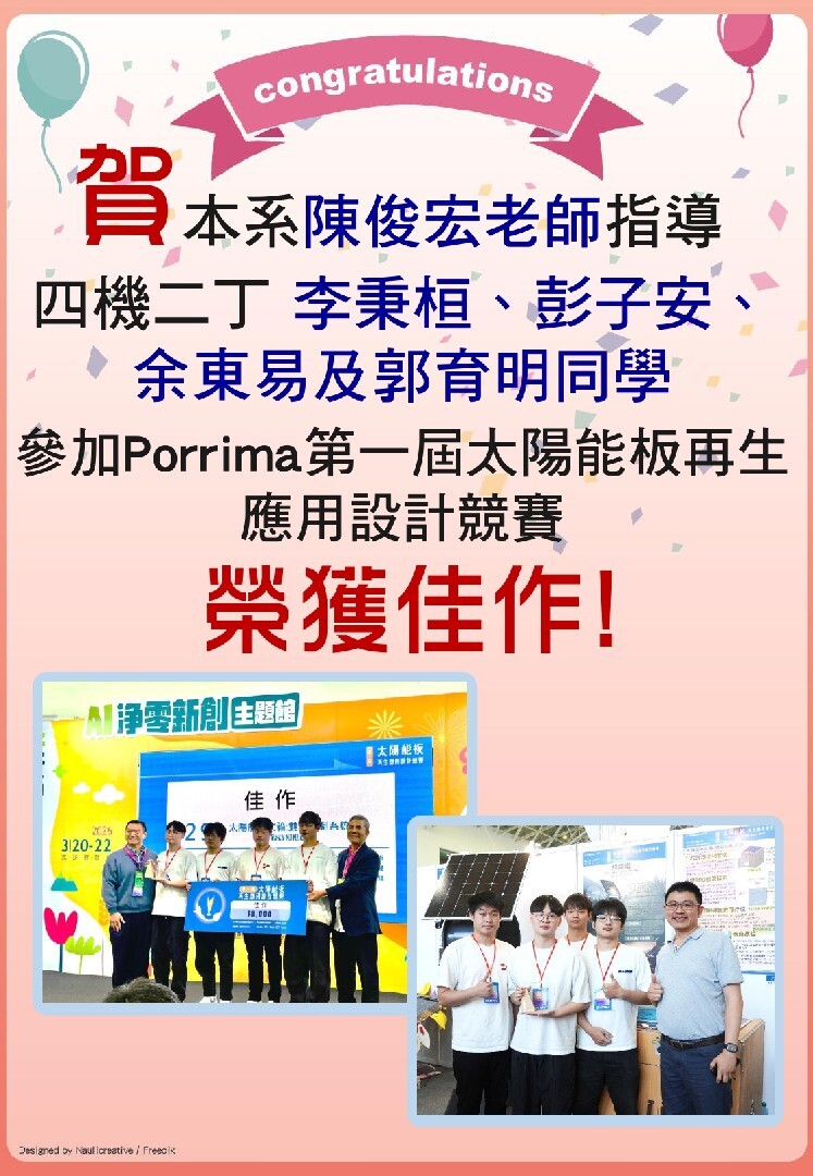 【賀本系師生榮獲佳作】第一屆 Porrima 太陽能板再生應用設計競賽